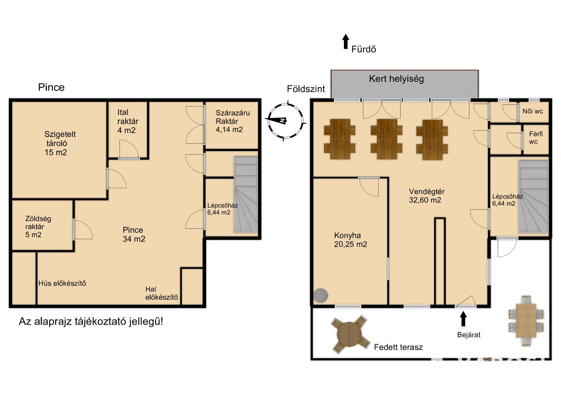 Földszint: konyha, vendégtér, bárpult, női, férfi illemhelyiség