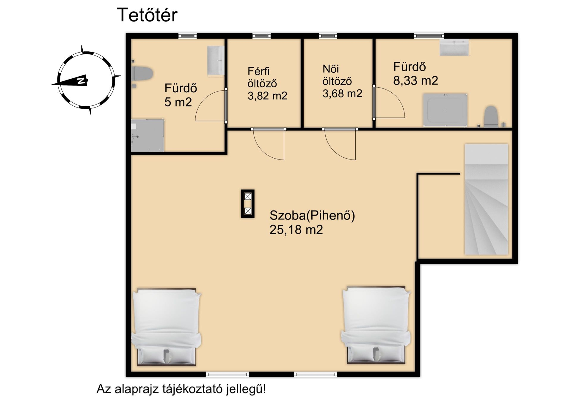 Tetőtér: szoba (pihenő), szociális helyiségek, női, férfi öltöző, 2 fürdő
