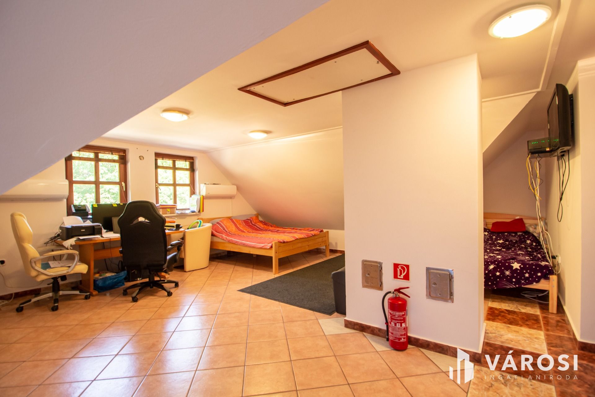 Egy kis ráfordítással könnyedén kialakítható 2 külön szoba és akár magánszálláshelyként is üzemeltethető a tetőtér.
