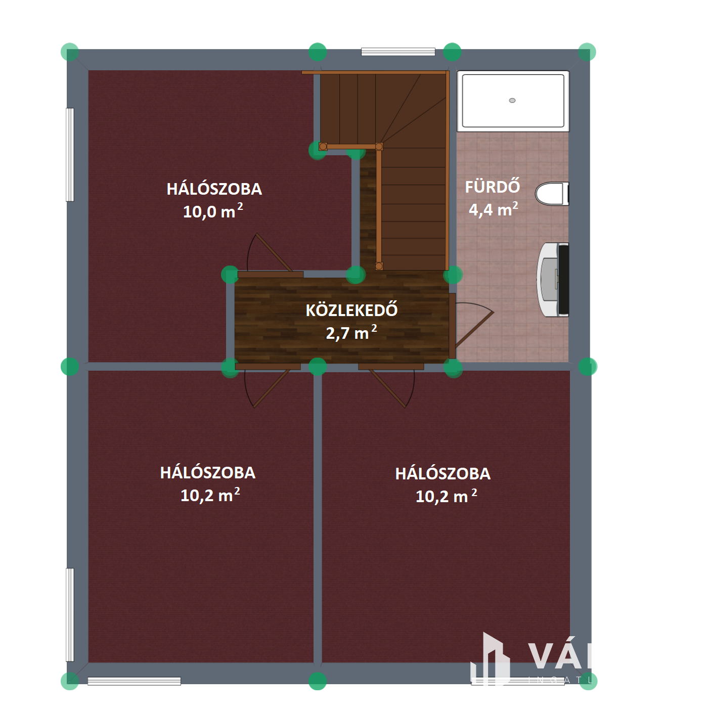 A ház második szintjén található további 3 hálószoba, illetve egy fürdőszoba. Ezekből lehet kijutni a nagyméretű emeleti teraszhelyiségre. Az épület kialakításának köszönhetően a szobák teljes értékűek, nem csökkenti a teret tetőív.