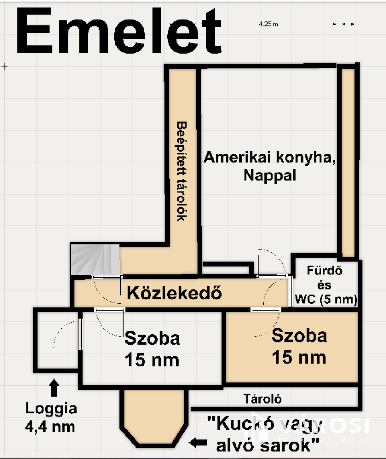 A tetőtérben tárolók vannak elrejtve kézzel művelt faburkolatok mögött. Itt 2 szoba található, egyikhez egy tágas kuckó van kialakítva vagy felnőtteknek ideális lehet az ágyat itt elhelyezni. A másik szoba napos, ideális dolgozó vagy gyerekszobának szintén.