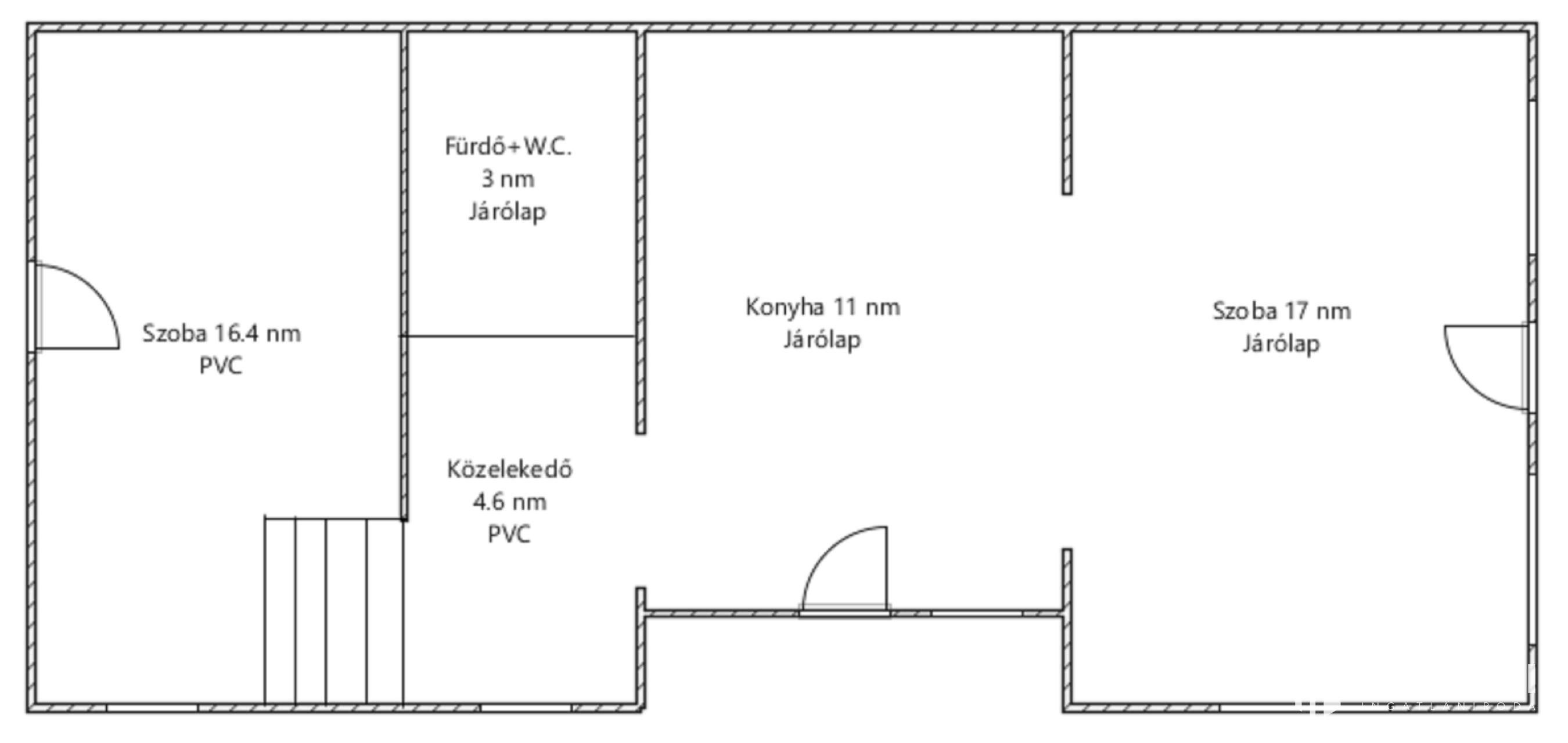 Helyiségei: 2 szoba, közlekedő, fürdőszoba, konyha.