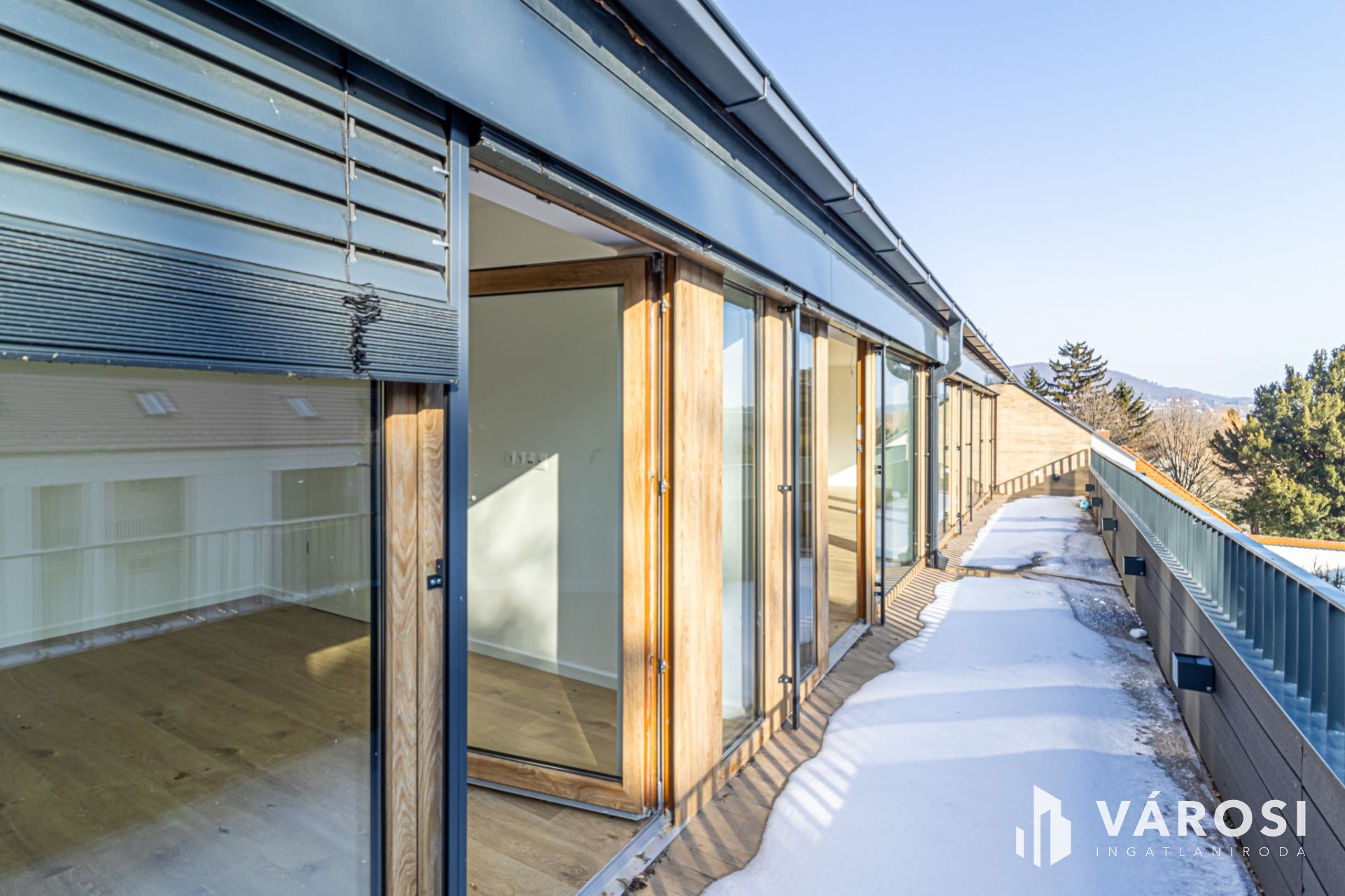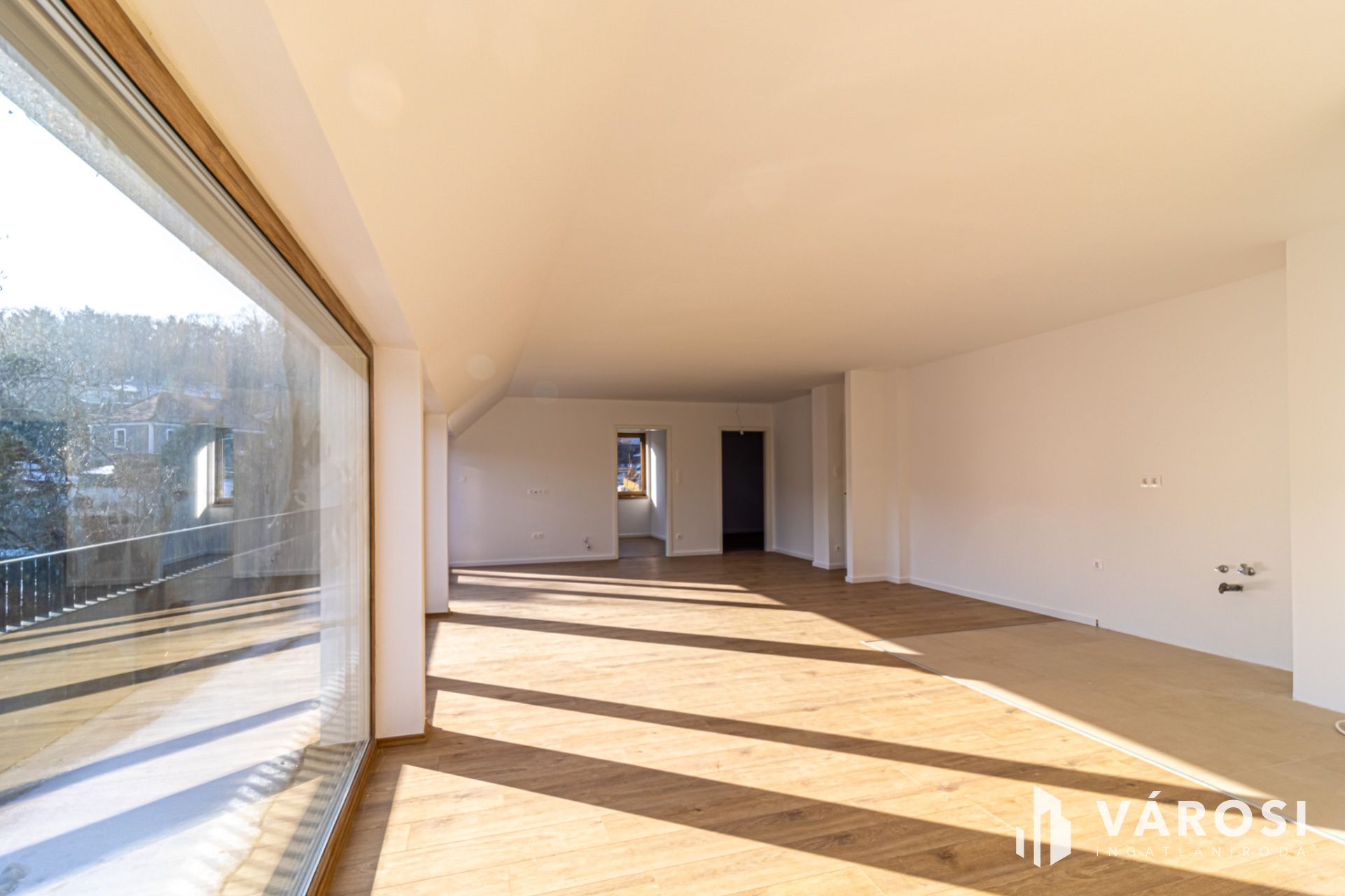 A 105,6 m²-es lakótérhez egy impozáns, közel 23 m²-es terasz kapcsolódik, amely az amerikai konyhás nappali és az egyik hálószoba előtt teljes szélességében végigfut. Délkeleti tájolásának köszönhetően egész nap világos, tágas terei és három külön nyíló hálószobája valódi életteret biztosítanak akár nagyobb család számára is.
