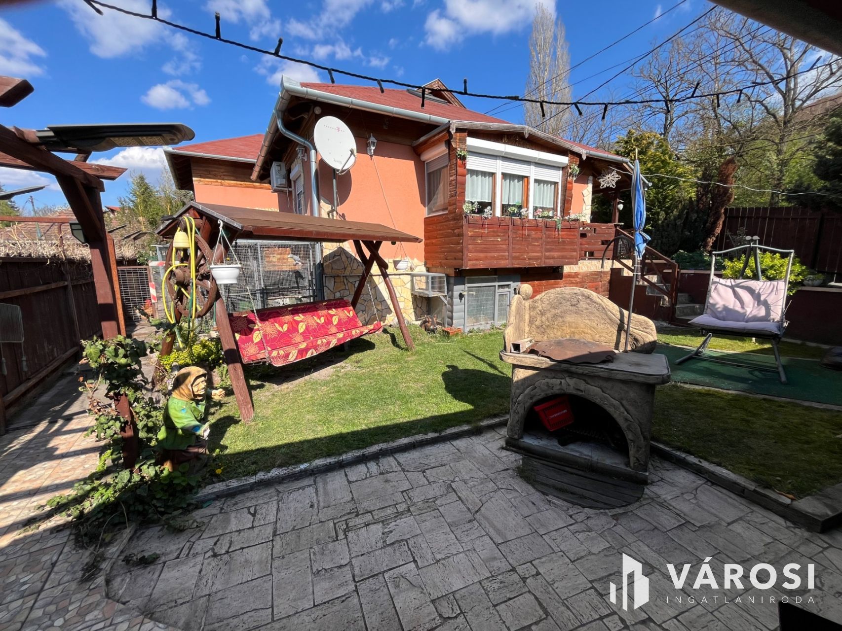 Két autó parkolására is alkalmas, fedett garázs, előkert, családi vagy társasági életre alkalmas oldalkert kerti konyhával, sütőgetővel.