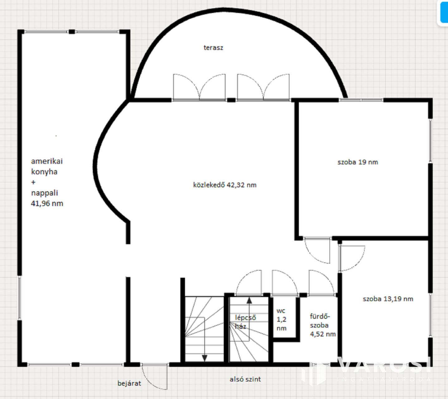 Alsó szinten: 2 szoba, fürdőszoba, wc, közlekedő, amerikai konyha és egy tágas terasz.