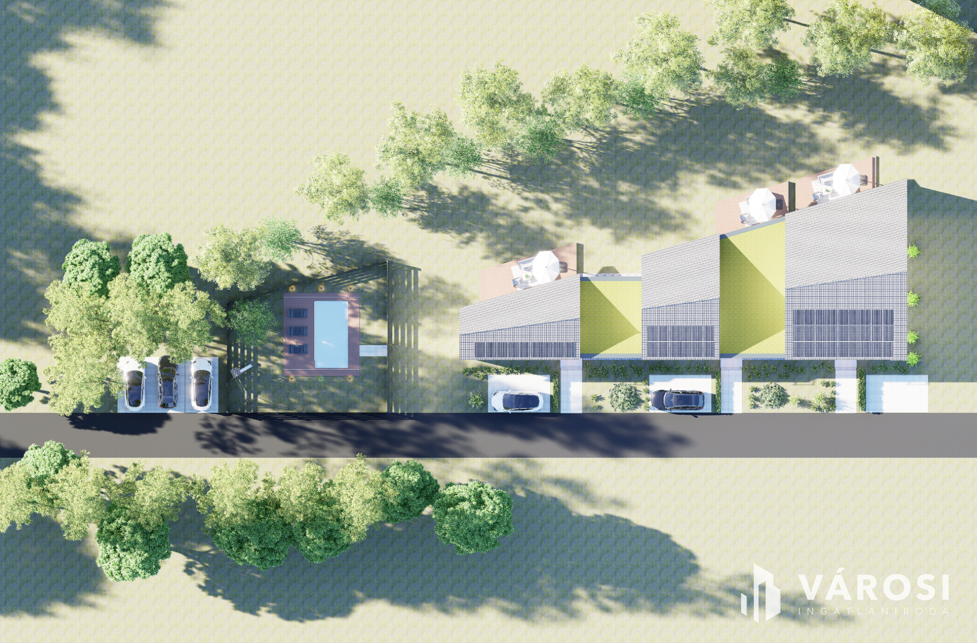 - ~100 m2 privát, csak a tulajdonosok számára elérhető, medence és napozó-játszó tér