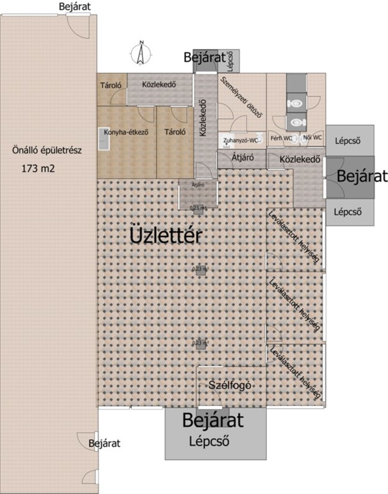 Ennek az épületrésznek 3 bejárata van és rendelkezik több fülkés külön női és férfi mosdóval, valamint szociális helyiséggel és egy személyzeti konyha-étkezővel. A kiszolgáló helyiségek kivételével a teljes tér egybenyitható.